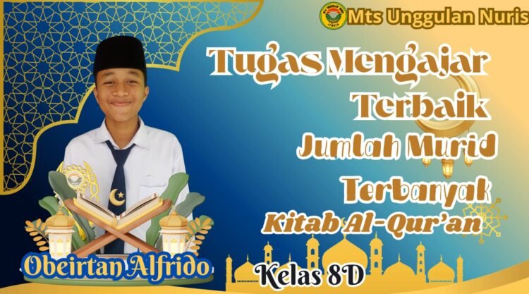 Pesantren Nuris – Tugas dalam mengajar bukanlah hanya sekedar menyampaikan materi, tetapi juga harus memperhatikan proses belajar murid yang diajar. Dimana langkah demi langkah harus senantiasa dilakukan dan mampu mengkomunikasikan ilmu pengetahuan dengan baik, hingga para murid bisa mencerna pelajaran lebih baik. Begitulah yang dilakukan oleh Obeirtan Alfrido, atau yang lebih dikenal dengan Bertan, siswa kelas 8D MTs Unggulan Nuris, hingga meraih Tugas Mengajar Terbaik Kategori Jumlah Murid Terbanyak Kitab Al-Qur’an MHQ PUTRA.