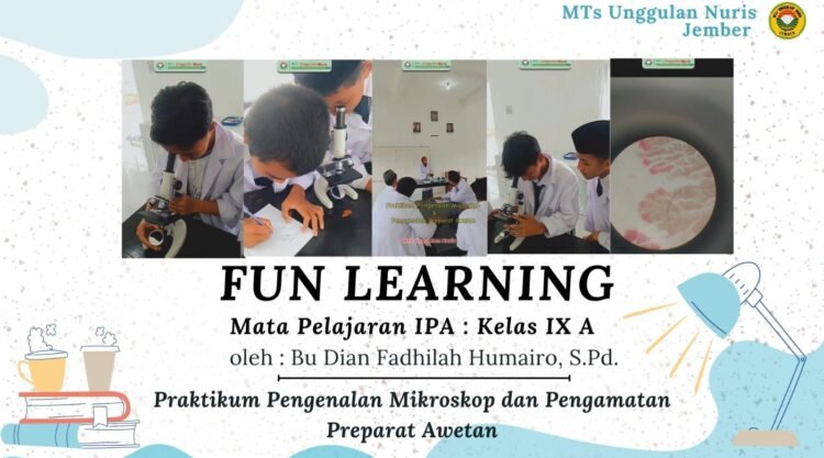 Pesantren Nuris – Pada Sabtu, 1 November 2025, MTs Unggulan Nuris Jember melaksanakan kegiatan supervisi fun learning pada mata pelajaran IPA yang dipandu oleh Bu Dian Fadhilah Humairo, S.Pd. Pembelajaran kali ini mengangkat tema Pengenalan Mikroskop dan Pengamatan Preparat Awetan, sebagai langkah awal siswa memahami dasar-dasar pengamatan biologi secara ilmiah melalui kegiatan praktikum laboratorium.