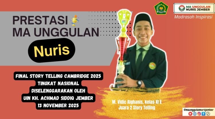 Pesantren Nuris – Muhammad Vidic Alghanis tak terhenti, selalu membanggakan almamater MA Unggulan Nuris dengan torehan prestasi gemilangnya. Melalui talenta hebatnya dalam seni bercerita dengan bahasa Inggris atau story telling, santri yang duduk di kelas XI E ini kembali berhasil menggondol piala di kancah nasional dalam ajang Final Story Telling Cambridge 2025 di UIN KH. Achmad Siddiq (KHAS) Jember pada Kamis, 13 November 2025 kemarin.