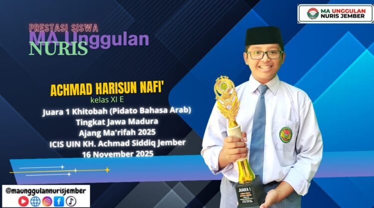 Pesantren Nuris – Menyampaikan orasi tentang Dinamika dan Peran Generasi Muda Muslim di Era AI (artificial Intellegence) berbahasa Arab dengan meyakinkan di hadapan juri dan penonton, Ahmad Harisun Nafi’ berhasil memenangkan ajang Ma’rifah 2025 Tingkat Jawa Madura yang diselenggarakan oleh ICIS UIN KH. Achmad Siddiq (KHAS)  Jember pada Ahad, 16 November 2025 kemarin.