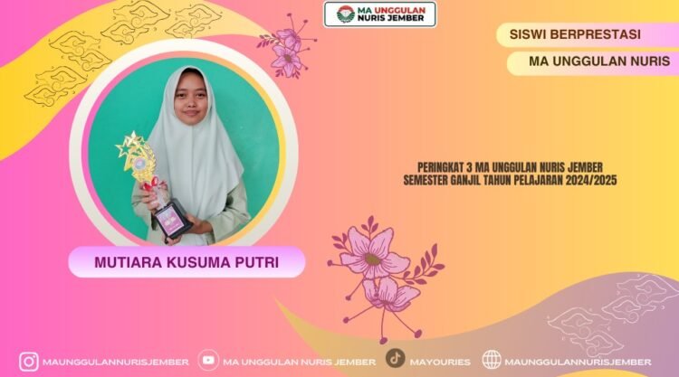 Pesantren Nuris — Mutiara Kusuma Putri, siswi kelas X C MA Unggulan Nuris Jember yang akrab disapa Mutiara, kembali menunjukkan kualitas akademiknya melalui capaian membanggakan pada Semester Ganjil Tahun Pelajaran 2024/2025. Dengan tekun dan penuh kesungguhan, Mutiara berhasil meraih peringkat 3 di kelasnya, prestasi yang tidak hanya membuat dirinya bangga, tetapi juga menjadi kebahagiaan tersendiri bagi kedua orang tuanya. Berasal dari Balung Jember, Mutiara dikenal sebagai pribadi yang tenang, rajin, dan memiliki hobi sederhana namun menenangkan, yaitu mendengarkan lagu sebagai cara untuk mengisi ulang energi di tengah padatnya aktivitas belajar. Di balik kelembutannya, ia menyimpan tekad kuat untuk menjadi orang sukses di masa depan—cita-cita yang terus ia jaga melalui disiplin belajar dan kemauan untuk selalu berkembang.