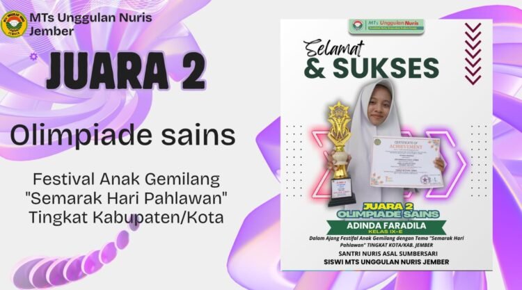 Pesantren Nuris – Adinda Faradila, siswi kelas IX E, berhasil memperoleh Juara 2 dalam cabang Olimpiade Sains pada Festival Anak Gemilang, 27 November 2025. Prestasi ini menegaskan kemampuan Adinda dalam memahami konsep-konsep sains secara mendalam.