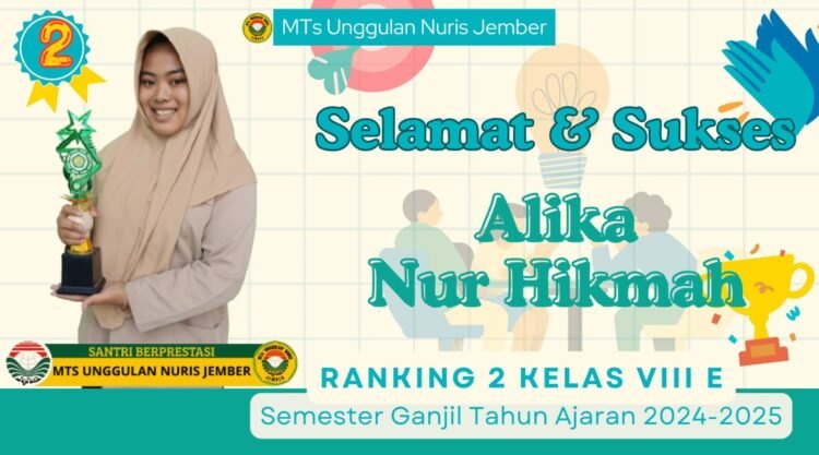 Pesantren Nuris – Semester ganjil tahun ajaran 2024–2025 menghadirkan kabar membahagiakan dari kelas VIII E MTs Unggulan Nuris Jember. Alika Nur Hikmah, siswi yang rajin dan penuh dedikasi, berhasil meraih juara 2 dengan prestasi akademik yang mengesankan. Pencapaian ini membuktikan bahwa ketekunan dan konsistensi belajar selalu membuahkan hasil.