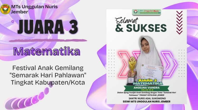 Pesantren Nuris – Angelina Viandra, siswi IX E, meraih Juara 3 dalam cabang Matematika di ajang Festival Anak Gemilang yang digelar pada 27 November 2025. Cabang matematika dikenal sebagai salah satu lomba dengan tingkat persaingan tertinggi.