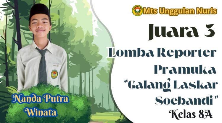 Pesantren Nuris – Bakat komunikasi dan jiwa kepanduan yang kuat mengantar Nanda Putra Winata, siswa Mts Unggulan Nuris, meraih prestasi membanggakan. Nanda berhasil menyabet gelar Juara 3 Reporter Pramuka dalam ajang “Lomba Pramuka Loka Galang Laskar Soebandi III” di tingkat Kabupaten Jember. Ajang ini sendiri diselenggarakan oleh SMK dr. Soebandi Jember.