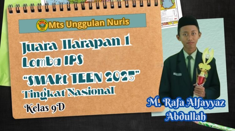 Pesantren Nuris – Mts Unggulan Nuris kembali menorehkan prestasi gemilang di kancah nasional. Kali ini, M. Rafa Al Fayyaz Abdullah, berhasil mencatatkan namanya sebagai Juara Harapan 1 dalam ajang kompetisi bergengsi Ilmu Pengetahuan Sosial, yaitu “SMART TEENS 2025.” Kompetisi ini diselenggarakan di tingkat nasional oleh SMA Al Furqan Jember.