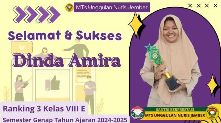 Pesantren Nuris – Semester genap tahun ajaran 2024–2025 kembali menghadirkan prestasi membanggakan dari kelas VIII E MTs Unggulan Nuris Jember. Dinda Amira berhasil mempertahankan posisi juara 3, membuktikan bahwa ketekunan dan kerja kerasnya sepanjang tahun memberikan hasil yang konsisten.