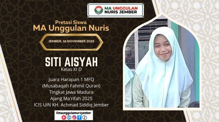 “Lomba MFQ pada Ahad, 16 November bulan lalu kami mengikuti ajang Ma’rifah di UIN KHAS Jember. Kami sempat masuk 2 besar nilai tertinggi, tetapi di babak final kami kurang cepat pencet tombol sehingga kalah poin di situ. Akan tetap, kami tetap bangga bisa menyumbang piala MFQ untuk MA Unggulan Nuris.” Tukas Aisyah.