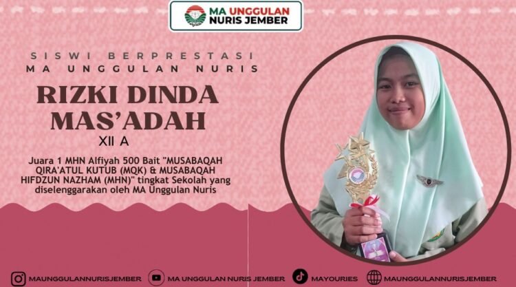 Pesantren Nuris — Rizki Dinda Mas’adah, siswi kelas XII A MA Unggulan Nuris Jember, kembali menunjukkan capaian akademik yang membanggakan melalui prestasinya sebagai Juara 1 dalam cabang MHN Alfiyah 500 Bait pada ajang MUSABAQAH QIRA’ATUL KUTUB (MQK) & MUSABAQAH HIFDZUN NAZHAM (MHN) tingkat sekolah yang diselenggarakan di lingkungan MA Unggulan Nuris. Prestasi yang diraih Dinda bukan sekadar hasil dari kecerdasan dalam menghafal, namun juga buah dari kebiasaan, kedisiplinan, dan proses belajar yang ia jalani secara konsisten. Dikenal sebagai siswa yang memiliki minat kuat dalam hafalan serta aktivitas olahraga, Dinda mampu menyeimbangkan aktivitasnya dengan baik sehingga kegiatan belajar nazham tetap berjalan tanpa tekanan yang berlebihan. Ia tumbuh dalam lingkungan belajar yang membentuk karakter tekun, sehingga proses menghafal Alfiyah sepanjang 500 bait menjadi bagian dari rutinitas yang ia lakukan dengan ritme stabil.