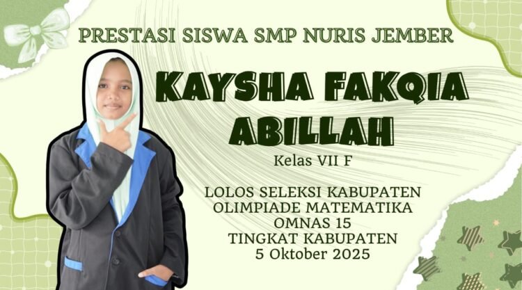 Pesantren Nuris — Prestasi membanggakan kembali ditorehkan oleh siswi SMP Nuris Jember. Kaysha Fakqia Abillah, siswi kelas VII F, berhasil lolos dalam bidang Olimpiade Matematika seleksi tingkat kabupaten yang dilaksanakan pada 5 Oktober 2025. Keberhasilan tersebut diraih dalam ajang OMNAS 15 (Olimpiade Nasional Matematika, Sains, dan Bahasa Inggris) Tingkat Nasional yang mempertemukan peserta-peserta terbaik dari berbagai daerah.