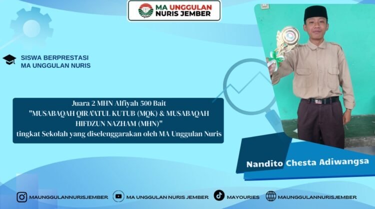 Pesantren Nuris — Nandito Chesta Adiwangsa, siswa kelas XI A MA Unggulan Nuris Jember, kembali mengukir prestasi membanggakan dalam ajang Musabaqah Qiraatul Kutub dan Musabaqah Hifdzun Nazham yang diselenggarakan oleh MA Unggulan Nuris. Lomba yang menghadirkan berbagai cabang ini menjadi wadah bagi para siswa untuk menunjukkan kemampuan akademik keagamaan, terutama dalam hafalan dan pemahaman teks klasik. Dalam ajang tersebut, Nandito yang akrab disapa dengan panggilan Nandit, Chesta, atau Dito berhasil meraih Juara 2 cabang MHN Alfiyah 500 Bait. Prestasi ini bukan hanya menunjukkan kapasitas akademiknya, tetapi juga membuktikan bahwa konsistensi, usaha, dan dukungan orang tua dapat membawa seseorang pada pencapaian yang luar biasa.