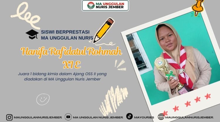 Pesantren Nuris — Ajang Olimpiade Sains Siswa atau OSS II yang diselenggarakan oleh MA Unggulan Nuris Jember kembali menjadi momentum penting bagi para siswa untuk menguji kemampuan akademik sekaligus menumbuhkan semangat berkompetisi secara sehat. Dalam ajang tersebut, Hanifa Rafidatul Rohmah, siswi kelas XI E yang akrab disapa Fida, berhasil meraih Juara 1 bidang Kimia. Prestasi ini menjadi pencapaian yang membanggakan, tidak hanya bagi dirinya, tetapi juga bagi keluarga dan lembaga pendidikan tempat ia menimba ilmu.