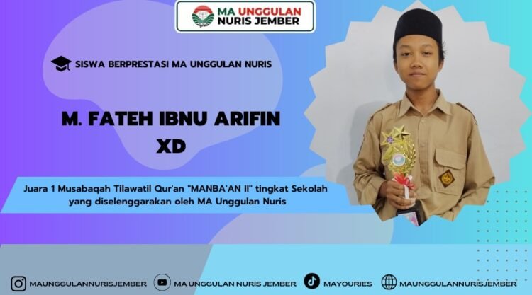 Pesantren Nuris — Prestasi membanggakan kembali ditorehkan oleh siswa MA Unggulan Nuris Jember melalui ajang MANBA’AN II tingkat sekolah yang diselenggarakan sebagai wadah pengembangan bakat dan potensi santri. Dalam salah satu cabang lomba bergengsi, yakni Musabaqah Tilawatil Qur’an, nama M. Fateh Ibnu Arifin, atau yang akrab disapa Ibnu, berhasil mencuri perhatian dengan raihan Juara 1. Siswa kelas X D ini berasal dari Sumbersari, Jember, Jawa Timur, dan sejak awal dikenal memiliki ketertarikan kuat pada dunia tilawah, seni suara, serta sholawatan, yang semuanya menjadi bagian dari kesehariannya di lingkungan sekolah dan pesantren.