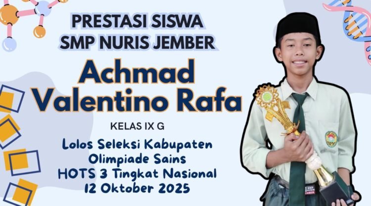 Pesantren Nuris — Prestasi membanggakan kembali ditorehkan oleh siswa SMP Nuris Jember. Achmad Valentino Rafa, siswa kelas IX G, berhasil lolos dalam bidang Olimpiade Sains seleksi tingkat kabupaten yang dilaksanakan pada 12 Oktober 2025. Keberhasilan ini diraih dalam ajang HOTS 3 Tingkat Nasional, sebuah kompetisi yang menuntut kemampuan berpikir kritis, analitis, dan pemahaman sains yang mendalam.