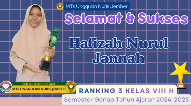 Pesantren Nuris – Semester genap tahun ajaran 2024–2025 kembali menghadirkan prestasi membanggakan dari kelas VIII H MTs Unggulan Nuris Jember. Hafizah Nurul Jannah berhasil meraih juara 3 dengan capaian akademik yang konsisten dan memuaskan. Keberhasilan ini menegaskan bahwa ketekunan yang dijalankan secara berkelanjutan selalu membuahkan hasil positif.