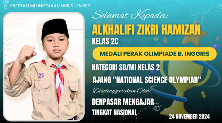 Khafi sukses meraih Medali Perak Olimpiade Bahasa Inggris Kategori SD/MI Kelas 2 dalam ajang bergensi “National Science Olympiad”. Kompetisi tingkat nasional yang diikuti oleh ratusan peserta dari berbagai daerah ini diselenggarakan oleh Denpasar Mengajar pada tanggal 24 November 2024.