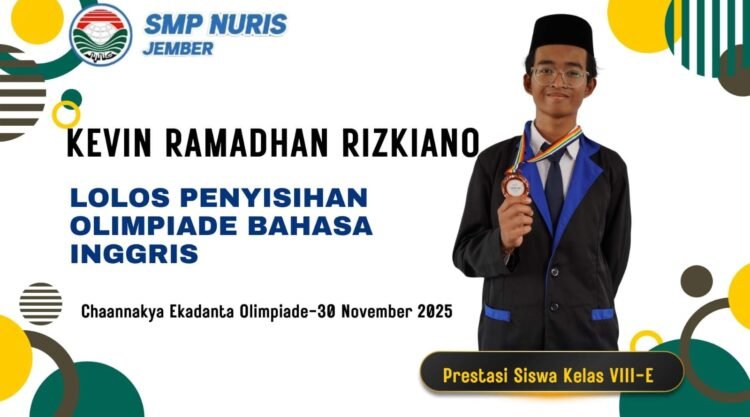 Pesantren Nuris – Prestasi membanggakan kembali ditorehkan SMP Nuris Jember melalui Kevin Ramadhan Rizkiano yang berhasil meraih medali gold dan lolos ke semi-final tingkat provinsi bidang Olimpiade Bahasa Inggris dalam ajang Chaannakya Ekadanta Olimpiade. Kompetisi bergengsi tersebut dilaksanakan pada 7 Desember 2025 di Fakultas Kesehatan Masyarakat Universitas Jember dan diikuti oleh peserta dari berbagai daerah. Capaian ini menjadi bukti konsistensi SMP Nuris Jember dalam membina potensi akademik peserta didik di tingkat kompetisi yang lebih tinggi.