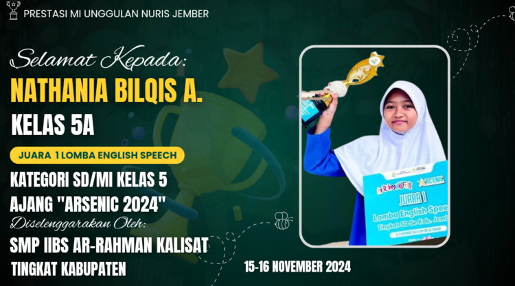 Pesantren Nuris – Prestasi di bidang akademik dan non-akademik terus mengalir dari MI Unggulan Nuris Jember. Kali ini, siswa yang membawa nama baik Madrasah bernama Nathania Bilqis A., atau yang akrab disapa Nathan. Siswi yang dikenal dengan sikapnya yang sopan dan sangat berkarakter ini berhasil membuktikan dirinya sebagai yang terbaik di bidang Bahasa inggris.