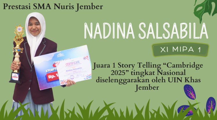Pesantren Nuris – Kabar membanggakan kembali datang dari SMA Nuris Jember. Nadina Salsabila, siswi kelas XI MIPA 1, sukses meraih Juara 1 dalam ajang bergengsi lomba Story Telling tingkat Nasional “Cambridge 2025”. Kompetisi yang diselenggarakan oleh UIN Khas Jember ini berlangsung meriah pada tanggal 13 November 2025 lalu.