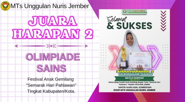 Pesantren Nuris – Kabar membanggakan kembali datang dari MTs Unggulan Nuris. Nayla Hasifah, siswi kelas IX F, berhasil meraih Juara Harapan 2 dalam cabang Olimpiade Sains pada ajang Festival Anak Gemilang tingkat Kabupaten/Kota Jember yang diselenggarakan pada 27 November 2025. Kompetisi ini menjadi salah satu bagian dari perayaan besar bertema “Semarak Hari Pahlawan.”