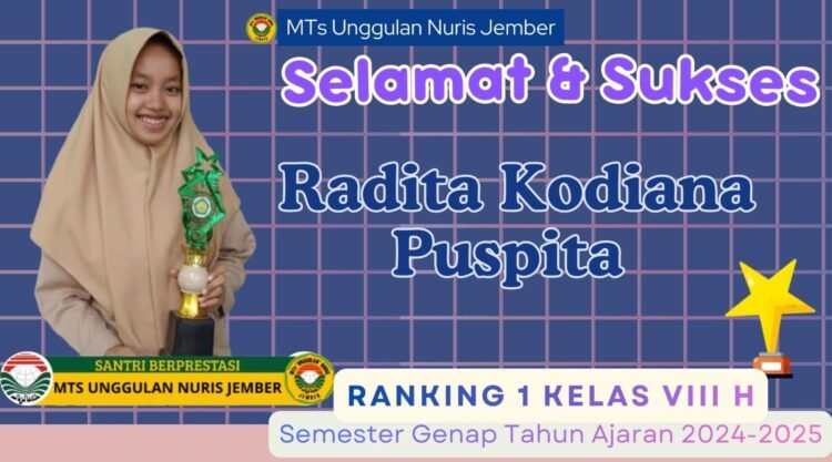 Pesantren Nuris – Semester genap tahun ajaran 2024–2025 kembali membawa kabar membanggakan bagi MTs Unggulan Nuris Jember. Dari kelas VIII H, salah satu siswi berprestasi, Radita Kodiana Puspita, berhasil meraih juara 1 dengan capaian akademik yang sangat membanggakan. Pencapaian ini menjadi bukti nyata bahwa konsistensi belajar serta kedisiplinan dalam mengikuti proses pembelajaran mampu menghasilkan prestasi terbaik.