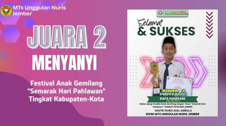 Pesantren Nuris – MTs Unggulan Nuris kembali mencatat prestasi di ajang Festival Anak Gemilang tingkat Kabupaten/Kota Jember. Rafa Hamdani, siswa kelas IX C, sukses meraih Juara 2 dalam cabang lomba menyanyi pada acara yang diselenggarakan pada 27 November 2025 dengan tema “Semarak Hari Pahlawan.”