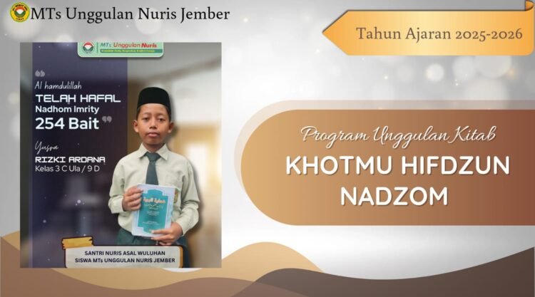Pesantren Nuris – Rizki Ardana, siswa kelas 3 C ULA/IX D, berhasil menghatamkan 254 bait Nadzom Imrity pada tanggal 3 November 2025. Prestasi ini menjadi bukti nyata dari kerja keras, disiplin, dan ketekunan yang konsisten, sekaligus menunjukkan kemampuan Rizki dalam memahami dan menghafal karya sastra klasik yang sarat nilai.