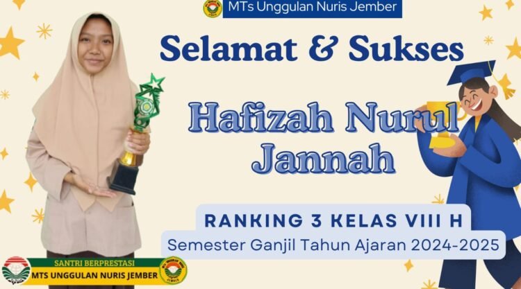 Pesantren Nuris – Semester ganjil tahun ajaran 2024–2025 menghadirkan kabar menggembirakan dari kelas VIII H MTs Unggulan Nuris Jember. Hafizah Nurul Jannah, siswi yang rajin dan disiplin, berhasil menempati juara 3 dengan prestasi akademik yang patut diapresiasi. Prestasi ini membuktikan bahwa ketekunan dalam belajar dan konsistensi dalam berusaha akan selalu membuahkan hasil.