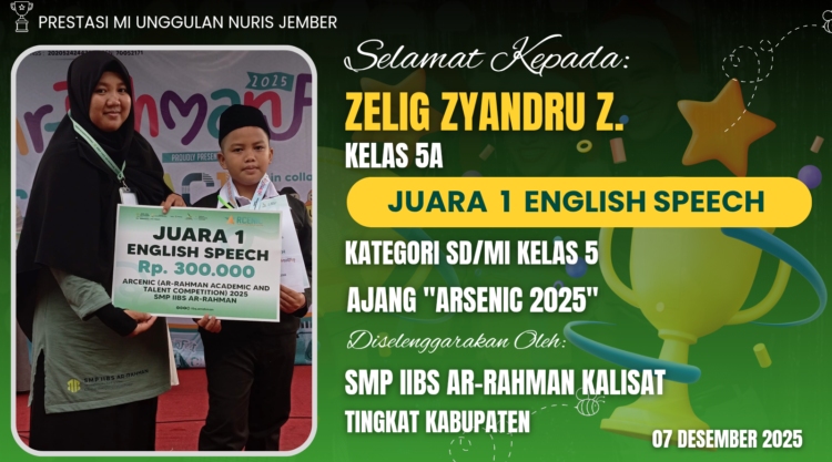 Pesantren Nuris – Pepatah lama mengatakan “kegagalan adalah kesuksesan yang tertunda”. Kalimat bijak ini benar-benar dibuktikan secara nyata oleh Zelig Zyandru Zain, siswa kelas 5A MI Unggulan Nuris Jember. Setelah sempat menelan pil pahit kekalahan di dua ajang sebelumnya, Zelig bangkit dengan kekuatan penuh dan berhasil meraih podium tertinggi sebagai Juara 1 English Speech.