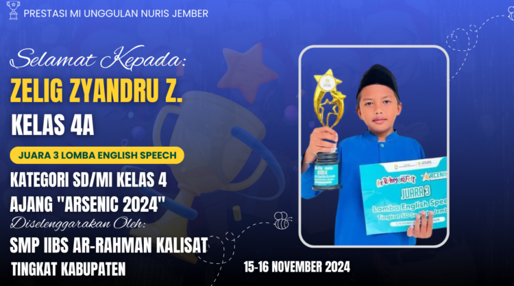 Pesantren Nuris – Kecerdasan dan bakat tak melulu diukur dari seberapa lantang seseorang berbicara. Hal ini dibuktikan oleh Zelig Zyandru Z., siswa kelas 4A MI Unggulan Nuris Jember. Siswa kalem ini berhasil membawa pulang prestasi membanggakan di Tingkat Kabupaten. Ia meraih Juara 3 Lomba English Speech dalam kompetisi bernama “ARSENIC 2024”.