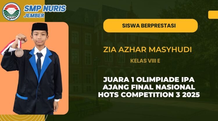 Pesantren Nuris – SMP Nuris Jember kembali menorehkan prestasi membanggakan melalui Zia Azhar Masyhudi yang berhasil meraih juara 1 bidang Olimpiade IPA pada ajang HOTS 3 TOPAZ Final. Kompetisi bergengsi tersebut dilaksanakan pada 20 Desember 2025 di Graha Universitas Negeri Surabaya dan diikuti oleh peserta terbaik dari berbagai daerah. Capaian ini menjadi bukti konsistensi SMP Nuris Jember dalam mencetak siswa berprestasi di bidang sains.