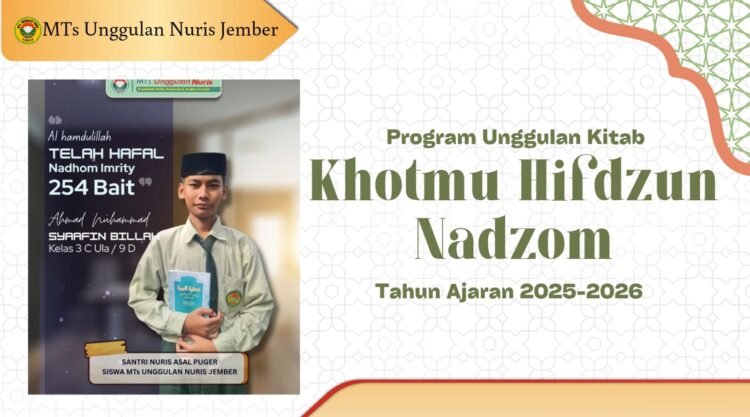 Pesantren Nuris – Syaafin Billah, siswa kelas 3 C ULA/IX D, sukses menghatamkan 254 bait Nadzom Imrity pada tanggal 3 November 2025. Prestasi ini menjadi bukti nyata dari disiplin, ketekunan, dan semangat belajar yang konsisten, sekaligus menunjukkan kemampuan luar biasa Syaafin dalam menghafal karya sastra klasik yang kaya makna.