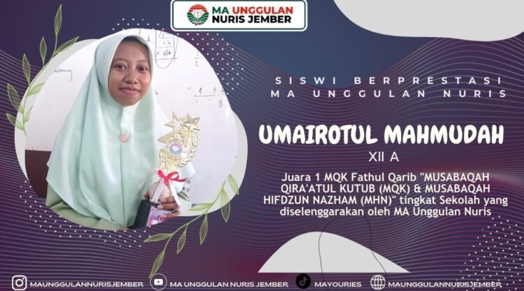 Pesantren Nuris — Umairotul Mahmudah, siswi kelas XII A MA Unggulan Nuris Jember yang akrab disapa Umai, kembali menunjukkan potensi akademiknya melalui capaian gemilang dengan meraih Juara 1 dalam cabang MQK Fathul Qarib pada ajang MUSABAQAH QIRA’ATUL KUTUB (MQK) & MUSABAQAH HIFDZUN NAZHAM (MHN) tingkat sekolah. Prestasi ini menjadi salah satu bukti dari perjalanan belajar yang ia jalani secara konsisten, terutama dalam mendalami kitab kuning yang menjadi bagian penting dari tradisi keilmuan di lingkungan pesantren dan madrasah. Dalam kesehariannya, Umai dikenal sebagai siswi yang tekun, santai dalam bersikap, namun serius ketika sudah berkaitan dengan kegiatan belajar, terutama pelajaran yang berkaitan dengan fiqih dan pemahaman kitab.