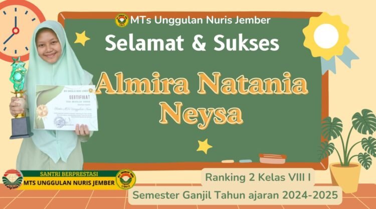 Dengan raihan juara dua pada semester ganjil tahun ajaran 2024–2025, Almira Natania Neysa diharapkan dapat terus mengembangkan kemampuan akademiknya serta meraih prestasi yang lebih baik di masa mendatang. Capaian ini membuktikan bahwa ketekunan dan semangat belajar yang tinggi akan selalu menghasilkan hasil yang membanggakan..[SM.Red]