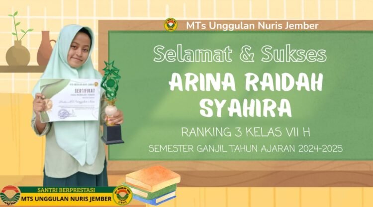 Pesantren Nuris – Prestasi akademik kembali menghiasi MTs Unggulan Nuris. Salah satu siswi kelas VII H berhasil menunjukkan kerja keras dan dedikasinya melalui pencapaian yang membanggakan, sekaligus memberikan inspirasi bagi teman-teman sekelas dan seluruh warga sekolah. Arina Raidah Syahira berhasil meraih peringkat ketiga pada semester ganjil tahun ajaran 2024–2025.