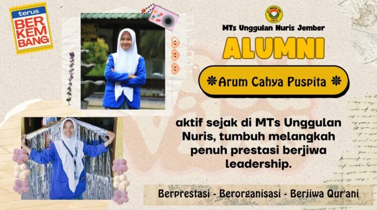 Melalui komitmen dan kegigihannya, Arum Cahya Puspita diharapkan dapat terus menorehkan prestasi baik di bidang akademik, organisasi, maupun keagamaan. MTs Unggulan Nuris Jember merasa bangga memiliki alumni yang berkarakter unggul dan terus berkembang setelah melanjutkan pendidikan di jenjang berikutnya. [SM.Red]