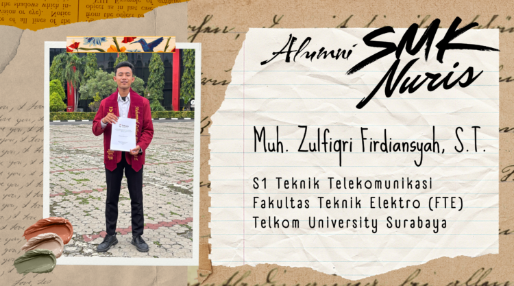 Pesantren Nuris – Muhammad Zulfiqri Firdiansyah, S.T. atau yang akrab disapa Firdi, merupakan salah satu alumni SMK Nuris Jember yang menorehkan capaian membanggakan di jenjang pendidikan tinggi. Lulusan Teknik Komputer dan Jaringan (TKJ) SMK Nuris Jember tahun 2022 ini berhasil menyelesaikan studi S1 Teknik Telekomunikasi di Fakultas Teknik Elektro (FTE), Telkom University Surabaya, dalam waktu relatif cepat dengan hasil akademik yang sangat memuaskan.