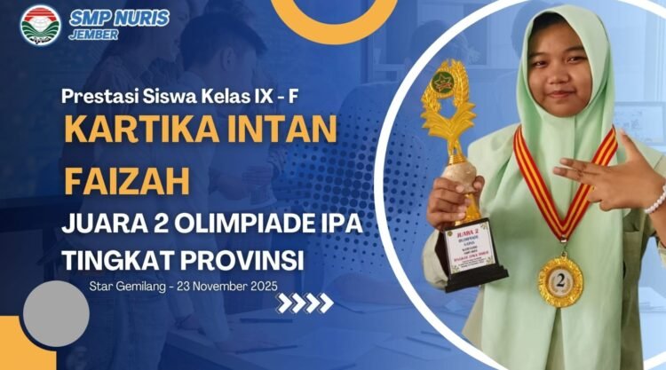 Pesantren Nuris – Prestasi membanggakan kembali ditorehkan SMP Nuris Jember melalui Kartika Intan Faizah yang sukses meraih Juara 2 Olimpiade IPA tingkat provinsi. Capaian ini diraih dalam ajang Star Gemilang yang digelar dengan persaingan ketat antarpeserta. “Saya ingin menambah pengalaman dan membanggakan orang tua,” ujar Kartika.