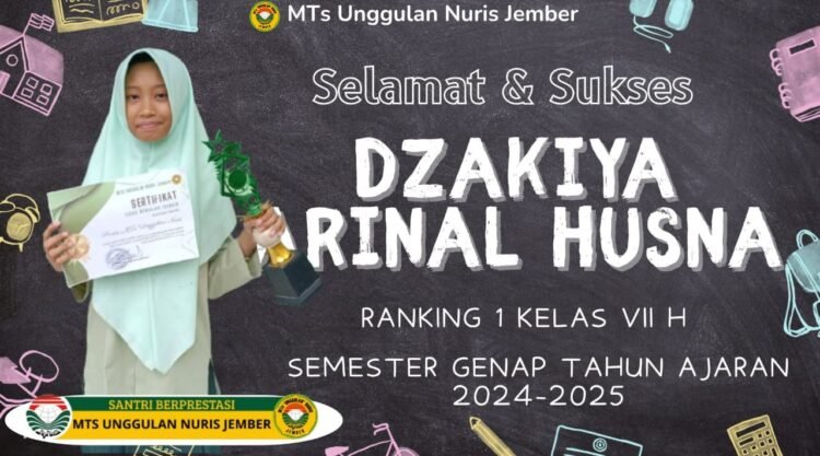 Pesantren Nuris – Kabar membanggakan kembali datang dari MTs Unggulan Nuris. Salah satu siswinya berhasil menorehkan prestasi gemilang pada semester genap tahun ajaran 2024–2025. Dzakiya Arinal Husna, siswi kelas VII H, kembali meraih peringkat pertama pada semester genap.
