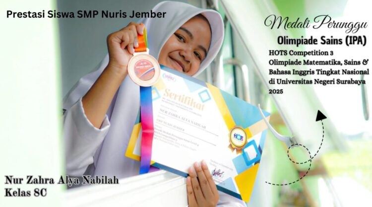 Pesantren Nuris — Prestasi kembali bersemi dari lingkungan SMP Nuris Jember. Kali ini, sorotan tertuju pada sosok siswi kelas VIII C, Nur Zahra Alya Nabilah, yang berhasil lolos hingga tahap final dan meraih Medali Perunggu dalam ajang HOTS 3 Tingkat Nasional bidang Olimpiade Sains. Babak final bergengsi ini dilaksanakan pada 20 Desember 2025 di Universitas Negeri Surabaya (UNESA), dengan persaingan yang berlangsung ketat dan penuh tensi akademik.