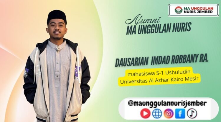 Pesantren Nuris – Di dunia ini tidak ada yang benar-benar tidak mungkin, asal mau berusaha dan bersungguh-sungguh berdoa atas segala impian, perlahan dan pasti semua pasti ada jalannya. Dausarian Imdad Robbany RA., santri lulusan MTs Unggulan Nuris tahun 2022 dan MA Unggulan Nuris, Jurusan PK (Program Keagamaan), tahun 2025, tahu betul bagaimana usaha kerasnya mencapai impian guna dapat belajar ushuludin di Universitas Al Azhar Kairo Mesir.