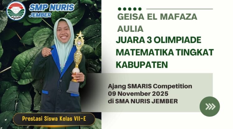 Pesantren Nuris – SMP Nuris Jember kembali menorehkan prestasi melalui Geisa El Mafaza Aulia. Siswi kelas VII-E ini berhasil meraih juara 3 bidang Matematika dalam ajang SMARIS Competition tingkat kabupaten. Kompetisi tersebut diselenggarakan oleh SMA Nuris Jember pada 9 November 2025. “Saya ingin menambah pengalaman baru di bidang matematika dan membanggakan orang tua,” ujar Geisa.