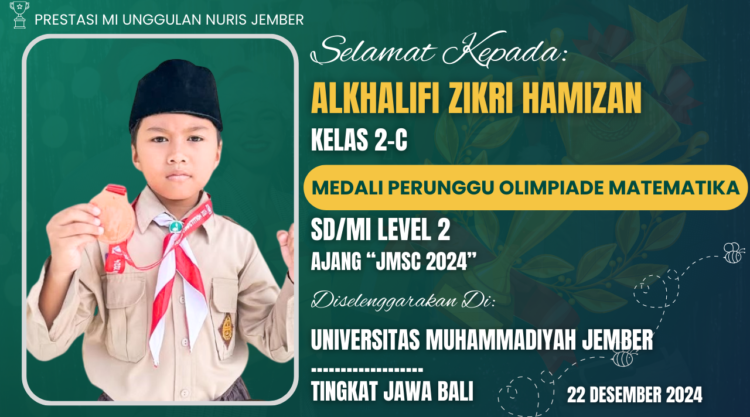 Pesantren Nuris – Kabar prestasi yang menyejukkan hati kembali datang dari keluarga besar MI Unggulan Nuris Jember. Kali ini, bintang kecil yang bersinar itu bernama Alkhalifi Zikri Hamizan, atau yang akrab disapa Khafi. Siswa yang dikenal cerdas dan santun ini sukses meraih Medali Perunggu Olimpiade Matematika kategori SD/MI Level 2.