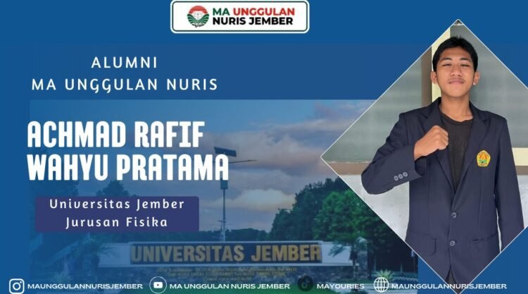 Pesantren Nuris — MA Unggulan Nuris kembali menorehkan kisah inspiratif dari para alumninya yang terus melangkah maju menatap masa depan. Salah satu alumni yang patut mendapat perhatian adalah Achmad Rafif Wahyu Pratama, atau yang akrab disapa Rafif. Pemuda kelahiran Jember tahun 2007 ini merupakan alumni MA Unggulan Nuris tahun 2025 yang kini melanjutkan pendidikannya di Universitas Jember, tepatnya di Jurusan Fisika. Perjalanan akademiknya menjadi gambaran nyata bagaimana proses pendidikan di MA Unggulan Nuris membentuk karakter, kedisiplinan, serta semangat juang alumni dalam meraih cita-cita.
