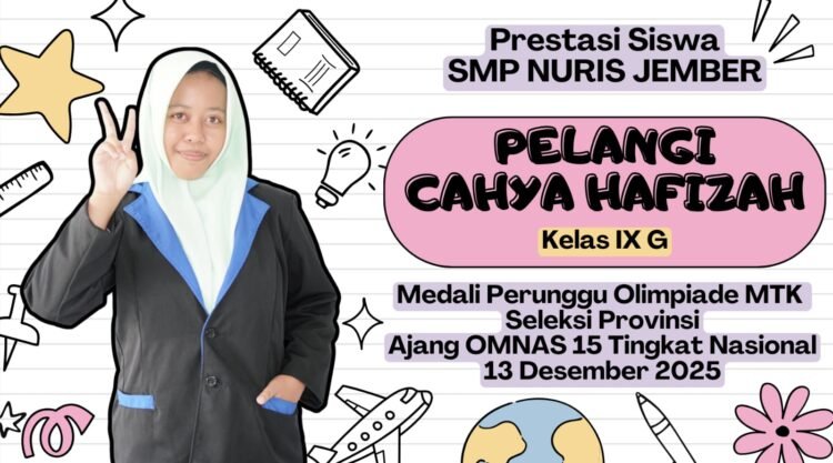 Pesantren Nuris — Nama Pelangi Cahya Hafizah, siswi kelas IX G SMP Nuris Jember, kini bersinar bak pelangi seusai hujan. Kerja keras, ketekunan, dan kecintaannya pada dunia angka berbuah manis setelah ia berhasil meraih Medali Perunggu dalam ajang Olimpiade Nasional Matematika, Sains, dan Bahasa Inggris (OMNAS) 15 Tingkat Nasional pada bidang Olimpiade Matematika.