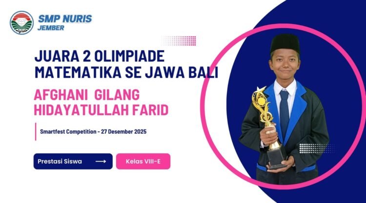 Pesantren Nuris – Prestasi gemilang kembali dipersembahkan SMP Nuris Jember melalui Afghani Gilang Hidayatullah Farid yang sukses meraih Juara 2 Olimpiade Matematika tingkat Jawa Bali pada ajang Smartfest. Capaian ini menunjukkan bahwa siswa SMP Nuris Jember mampu tampil percaya diri dan kompetitif di arena bergengsi. “Saya senang sekaligus tertantang karena persaingannya sangat ketat,” ujar Afghani.