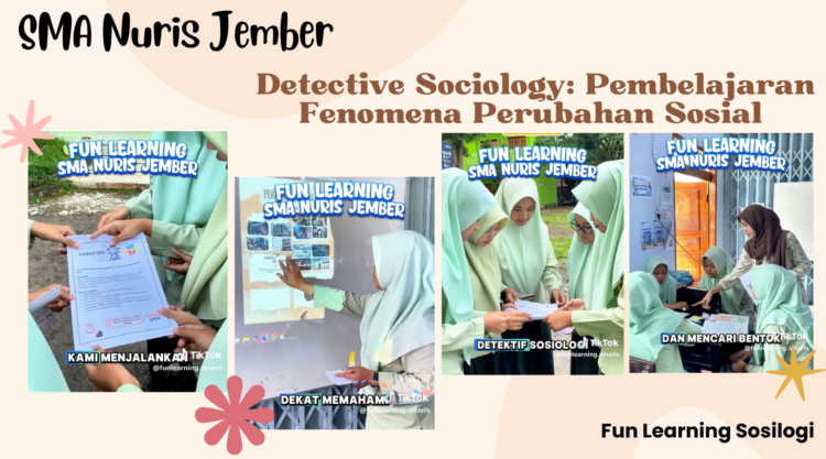 Pesantren Nuris – Suasana kelas XII IPS 2 SMA Nuris Jember pada Sabtu, 2 Agustus 2025, tampak berbeda dari biasanya. Tidak hanya duduk diam mendengarkan penjelasan guru, para siswi justru sibuk dengan berbagai properti unik, mulai dari alat tulis, stick notes, property detektif, hingga gawai di tangan mereka. Hari itu, mereka sedang menjalankan misi khusus bertajuk “Detective Sociology: Mission Social Change”.