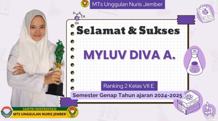 Pesantren Nuris – Prestasi membanggakan kembali diraih oleh siswi MTs Unggulan Nuris. Myluv Diva A., siswi kelas VII E, berhasil meraih peringkat kedua pada semester genap tahun ajaran 2024–2025. Capaian ini menjadi hasil dari kerja keras dan kesungguhan yang ia tunjukkan selama mengikuti proses pembelajaran, serta menjadi kebanggaan bagi kelas VII E.