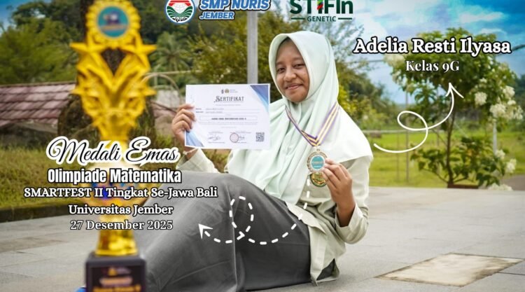 Pesantren Nuris — Prestasi gemilang kembali ditorehkan oleh salah satu siswi terbaik SMP Nuris Jember. Kali ini, Adelia Resti Ilyasa, siswi kelas IX G, berhasil mengharumkan nama sekolah dengan meraih Medali Emas Olimpiade Matematika dalam ajang SMARTFEST II tingkat Se Jawa–Bali. Kompetisi bergengsi tersebut digelar pada 27 Desember 2025 bertempat di Gedung FKIP Universitas Jember (UNEJ) dan diselenggarakan oleh Mitra Usaha.