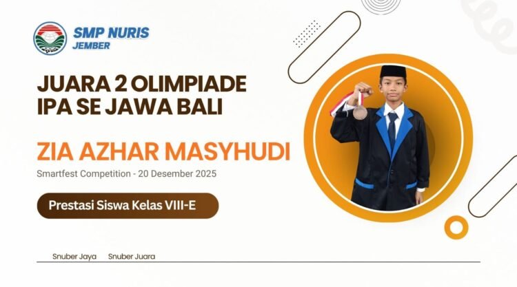 Pesantren Nuris – Prestasi membanggakan kembali diraih SMP Nuris Jember melalui Zia Azhar Masyhudi yang sukses meraih Juara 2 bidang Olimpiade IPA tingkat Jawa Bali pada ajang Smartfest. Capaian ini menunjukkan daya saing siswa SMP Nuris Jember di level regional yang semakin kuat. “Saya tidak menyangka bisa sampai sejauh ini dan sangat bangga,” ungkap Zia.